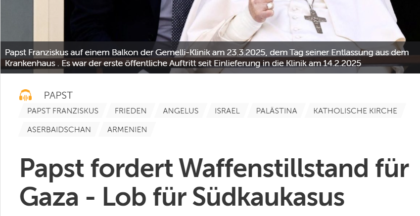 Papst Franziskus bewusst kein Opfer-Täter-Umkehr Bild gezeichnet. Die Opfer-Täter-Umkehr ist ein wichtiges Propagandainstrument der Helfer und Helfershelfer zionistischer Völkermorde. Aber er stellt die Mütter der Palästinenser, deren Angehörige Opfer waren, mit den Müttern von Verbrechern gleich .
