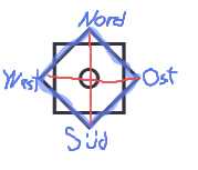 Zwei Quadrate übereinander gelegt und zwar exakt so, dass sie ein rotationssymmetrisches Gebilde mit acht Ecken ergeben. Mit diesem Gebilde können wir eine Wand kacheln . Gelingt uns dies fugenfrei, ist die ganze Wand mit Kacheln bedeckt. Das auf einer Spitze stehende blaue Quadrat können wir mit den Namen der 4 Winden beschriften. Nord, Ost, West und sSüd.
